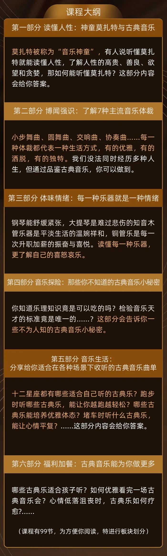 99节课包含了音乐大师故事,古典音乐品鉴方式,基础音乐理论,全方位读懂古典音乐,让你不再犯愁“怎么听”;