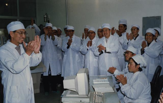 1989年11月,核能所所长王大中(左一)宣布5兆瓦核供热反应堆启动运行成功。图/清华大学