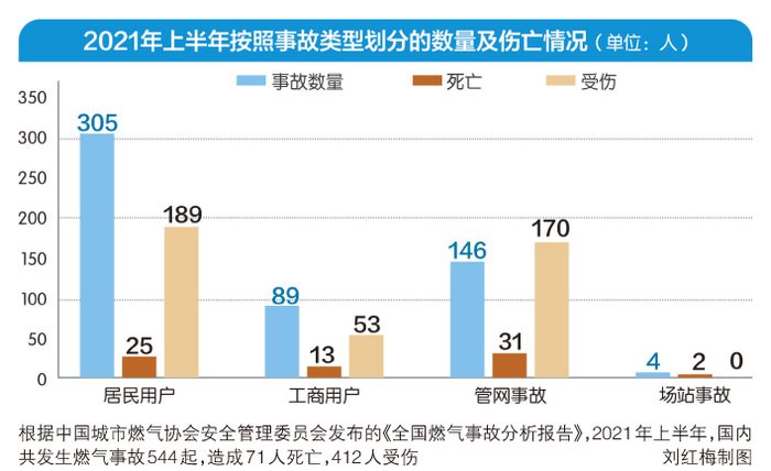 2021年上半年,根据中国城市燃气协会安全管理委员会发布的《全国燃气事故分析报告》统计,国内共发生燃气事故544起,造成71人死亡,412人受伤。