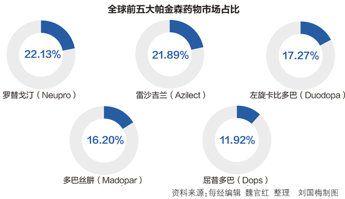 资料显示,全球前五大帕金森药物分别为罗替戈汀(Neupro)、雷沙吉兰(Azilect)、左旋卡比多巴(Duodopa)、多巴丝肼(Madopar)以及屈昔多巴(Dops)。《每日经济新闻》记者注意到,国内目前只有普拉克索(森福罗)有仿制药,近两年恒瑞医药、石药集团、齐鲁制药等多家公司仿制药上市,但临床用药还保持在进口药品垄断的局面。