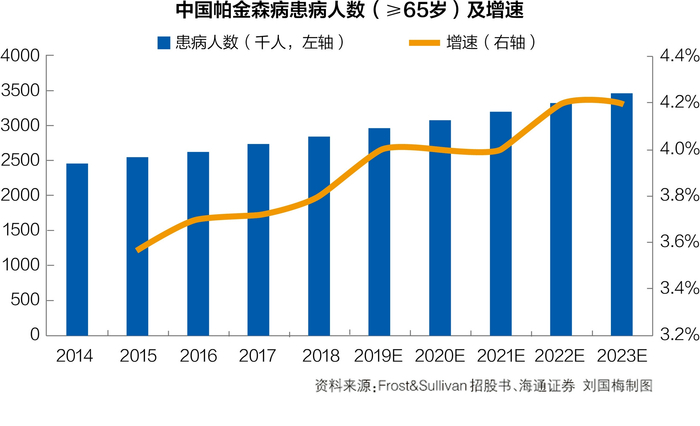 罗晓光和陈伟都认为,这与帕金森病的受众规模相对较小有关。虽然公开数据显示,中国有约300万名帕金森患者,且以每年10万人的增速递增,但与常见病比起来,这个数字还是较小。据张青了解到的数据,目前帕金森病的就诊率约四成,每年不到50万人,再加上有些原研药还没过专利期,药企也没有资格仿制。如果要做创新药,对于一般规模的药企来说,社会效益大于经济效益,还要看是否有能力做这个事。