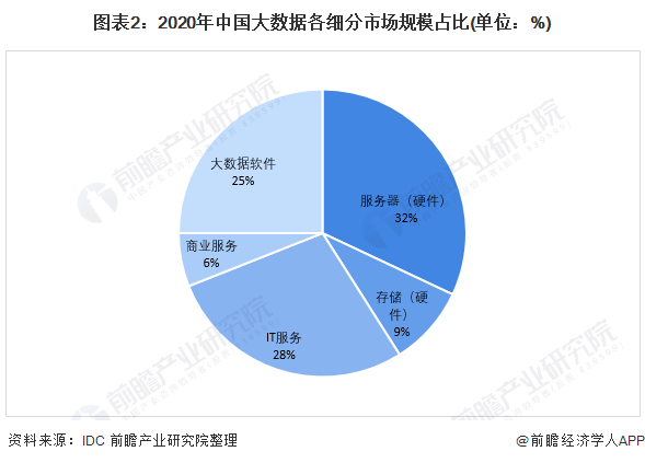 根据《IDC全球大数据支出指南》,2020年中国大数据市场最大的构成部分来自于传统硬件部分——服务器和存储,占比超过40%,其次为IT服务和商业服务,两者共占34%的比例,剩余由25%的大数据软件所构成。
