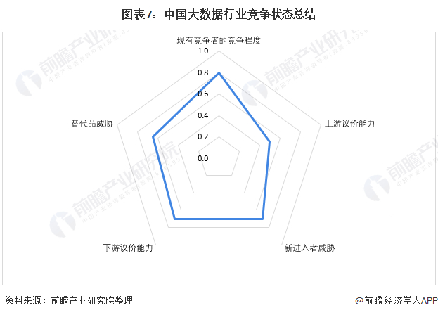 从五力模型角度分析,我国大数据产业链中参与者众多,面向各行各业的应用市场,分别在不同的层级竞争,在各个层级中,都聚集了大量企业,市场化程度高,竞争较为激烈;同时,大数据行业作为数字化发展过程中不可或缺的技术与手段,来源于生活的方方面面,各种大数据收集渠道与分析工具等众多,面临的替代品威胁较大。
