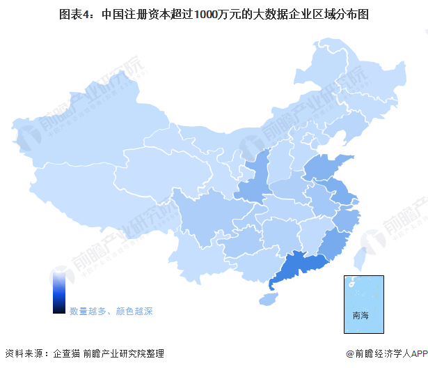 目前,我国大数据企业分布在产业链各个环节,包括大数据基础的硬件、软件支撑与大数据服务。行业龙头企业均专注其重点布局领域,在各个方向拥有明显的特有优势。在区域分布方面,中国大数据企业较为集中,主要分布在京津冀与东部沿海地区。