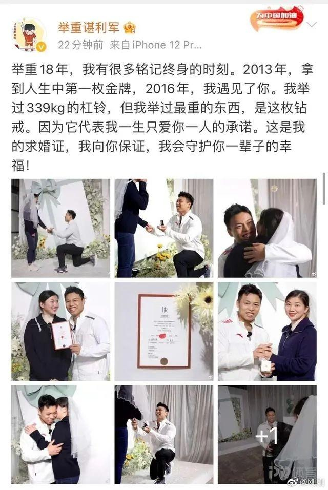 勘利军表示:“举重18年,我有很多铭记终身的时刻。2013年,拿到人生中第一枚金牌,2016年,我遇见了你。我举过339kg的杠铃,但我举过最重的东西,是这枚钻戒。因为它代表我一生只爱你一人的承诺。这是我的求婚证,我向你保证,我会守护你一辈子的幸福!”