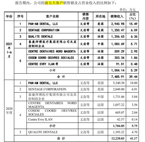 不过,记者发现,在前五大客户中,每年都有泰康拜博医疗集团有限公司的身影。2018年-2020年,家鸿口腔分别对其实现销售收入2023.88万元、2097.25万元和1731.86万元,对应占当期销售比例分别为8.11%、6.77%和5.84%。