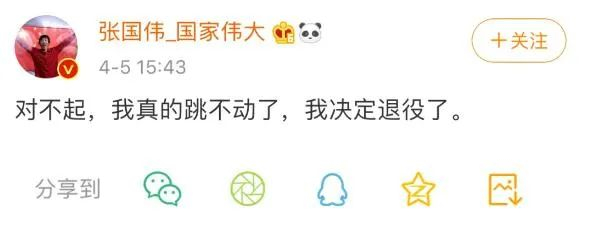 11天之后,张国伟发文:“对不起,我真的跳不动了,我决定退役了。”