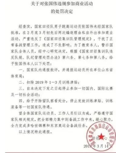 2019年3月,一份田管中心处罚决定在网络上流传:张国伟被核实在2月底和3月初先后两次编造理由私自外出参加商业活动,“严重违反了国家田径集训队管理规定,干扰了正常备战工作,造成不良影响”。田径管理中心对张国伟进行了包括“给予开除留队察看处分”等一系列处罚。