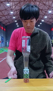 倒置一个啤酒瓶,下边放上几块积木,然后用苍蝇拍一块一块横抽掉,瓶子成功倒扣在桌面上……露出得意表情的张国伟,又在手机镜头前完成了一次挑战。