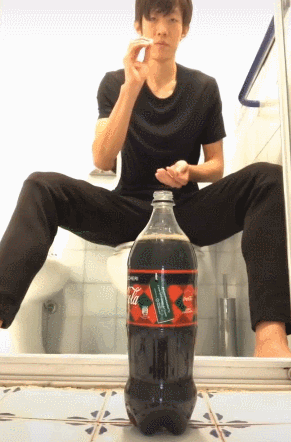 2019年11月15日,视频中的张国伟站在卫生间的淋浴喷头下,将可乐使劲摇晃后打开瓶盖,然后面对喷涌而出的可乐把嘴凑上去“对瓶吹”。
