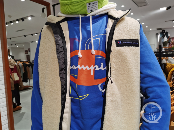 伍先生讲述,10月26日在三峡广场看到这家店眼熟的全英文字母品牌时,“我的第一感觉这就是Champion。”店门口贴着“冬季新品,买一送一”广告,走进店里还发现中文商标也有“冠军”字样,于是挑选购买了3件外套,合计1183元。