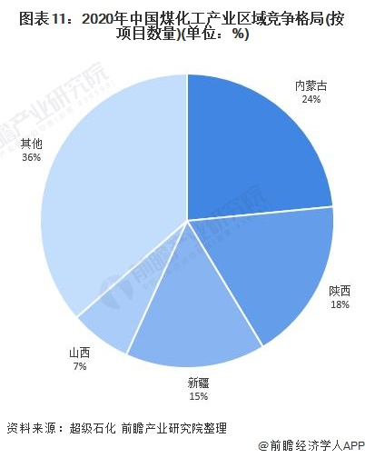 前瞻根据超级石化的资料整理了我国当前煤化工项目,根据项目所在区域分析,内蒙古、陕西、新疆和山西是我国的煤化工产业项目落地较多的区域。这些地区的煤矿资源丰富、有较多煤矿采选企业和完整的产业链生态。其中内蒙古落地的煤化工项目最多,份额达24%;其次为陕西,份额达到18%。