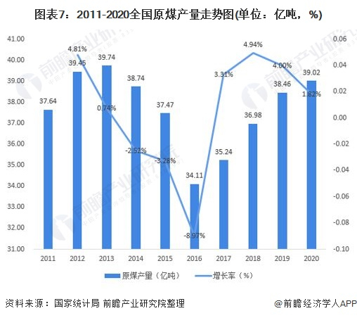 2011-2020年,我国煤炭产量呈现出强周期性。2013年我国原煤产量达到顶峰,之后产量逐年下降,最终在2016年原煤产量企稳,2017年后产量开始逐年上升。我国的煤碳开采受政策影响较大。近几年原煤产量总体受国家供给侧改革影响的波动调整。2020年,我国煤炭产量为39.02亿吨,同比增长1.82%。