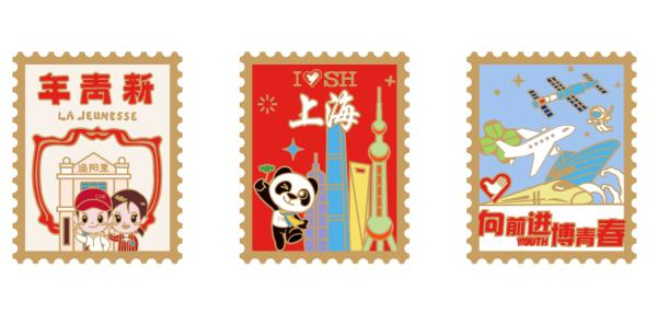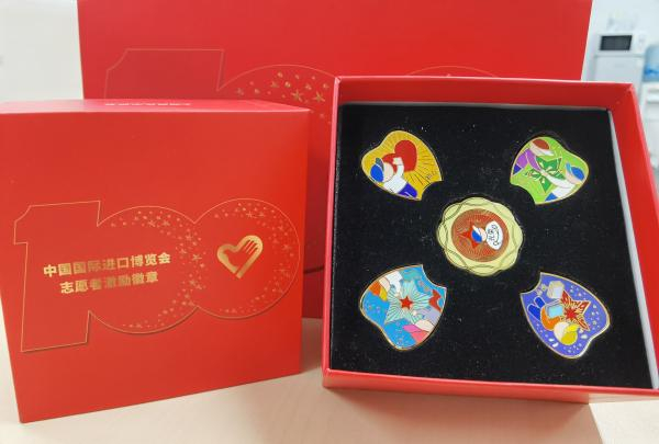 今年的进博会志愿者徽章,首次设计盲袋形式,一套3枚,寓意着过去、现在与将来