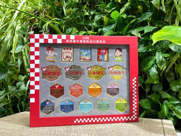 由团市委推出的进博会志愿者徽章分为专属徽章和激励徽章两类。前者主要展示志愿者服务岗位及服务年限,对应发放给每位志愿者,后者则需要通过完成相应任务来领取。