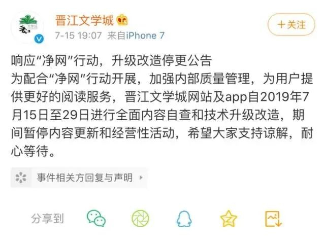 晋江随即发布整改声明,关停了部分栏目并停止更新原创分站15天。此事过后不到3个月,晋江再被约谈,2019年8月扫黄打非办公示网络文学专项整治的阶段性进展,晋江一年内第三次被点名。