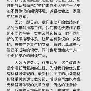 在具体措施上,公告表示会逐步把作品按照不同的标签、类型,纳入不同年龄段的推荐体系,“让那些有争议、尖锐的、思想性更复杂的文章,暂时远离那些心智还不成熟的读者。”优先分级的会是某“最受社会关注的小众题材”。