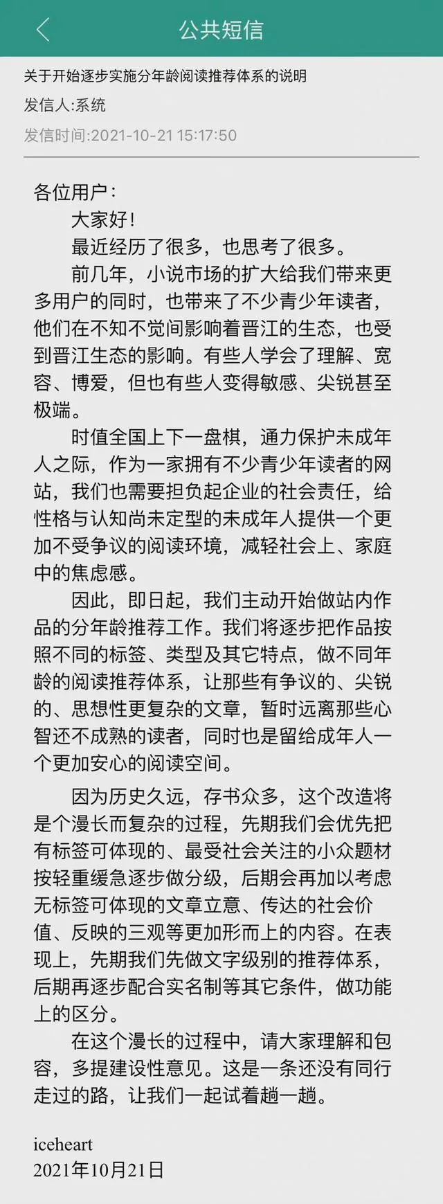 近期晋江文学城发布站内公告,表示将在全国上下通力保护未成年人之际主动承担企业责任,开始推行站内作品的分年龄推荐工作。