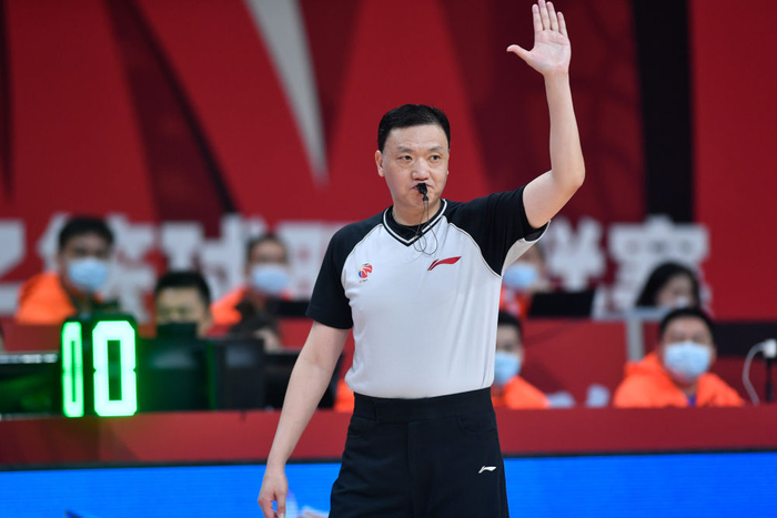 2021年1月27日,主裁判叶楠在比赛中执裁。当日,在浙江诸暨举行的2020-2021赛季中国男子篮球职业联赛(CBA)第二阶段第35轮比赛中,吉林九台农商银行队以103比93战胜天津先行者队。新华社记者黄宗治摄
