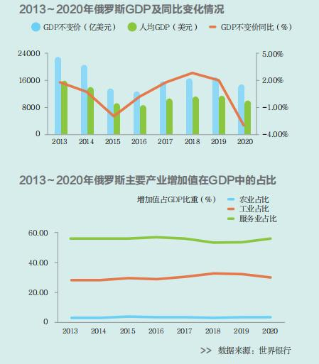 2015~2018年,俄罗斯经济逐步恢复,主要经济指标连续三年实现正增长。但是,受新冠肺炎疫情影响,2020年,俄罗斯经济出现显著下滑,国民生产总值(GDP)同比下降2.95%。