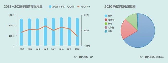 在电力生产方面,2013~2019年,俄罗斯发电量从1059.1太瓦时增至1118.1太瓦时,年均增速0.9%。2020年,俄罗斯发电量为1085.4太瓦时,比上年下降2.9%,为近7年首次回落。