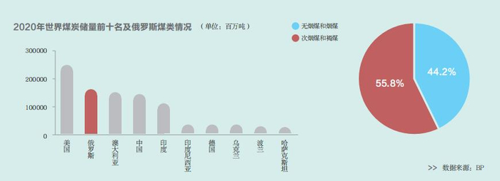 在煤炭方面,截至2020年年底,俄罗斯煤炭储量为1621.66亿吨,位居全球第二,已探明储量的一半是优质煤,灰分含量(低于15%)和硫含量(不超过1%)较低。然而,俄罗斯近94%的煤炭资源集中在西伯利亚和远东地区,其中不少矿区位于开发程度低的高寒地区,这导致其煤炭开采及运输成本较高。