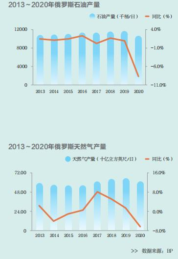 在石油生产方面,2013~2019年俄罗斯石油产量呈现持续增长态势,从1080.7万桶/日增至1167.9万桶/日,年均增速达到1.35%。2020年受新冠肺炎疫情影响,石油需求显著下降,欧佩克履行限产协议,俄罗斯石油产量出现回落,为1066.7万桶/日,同比下降8.7%。