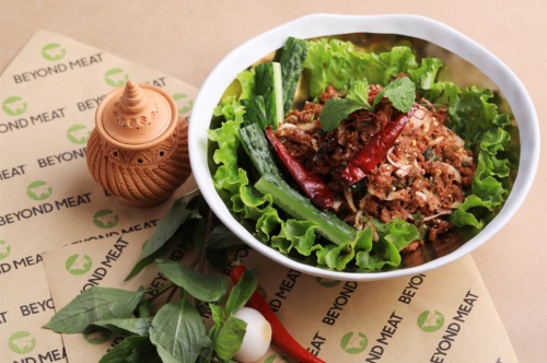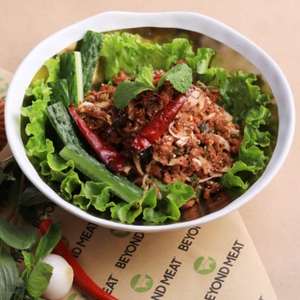 王府中环东座4层颠覆传统泰餐概念的全新现代派“摩登泰”——KEAAMI,从环境到菜品的全新升级,淋漓展示国际现代派“摩登泰”的风格。泰式“植物肉”碎沙拉源自泰国经典的鸡肉碎沙拉,将煮好的植物肉碎,加入丰富的香料,有柠檬草、洋葱、香茅、干辣椒以及糯米粉后,进行充分的搅拌,淋上泰国酱汁,可搭配生菜和黄瓜食用。用植物肉高度还原真肉的口感,带来低脂肪餐食,酸辣之中有着浓厚的肉香,富有层次感。
