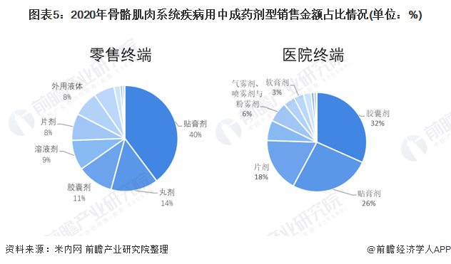 根据米内网医院终端和零售终端数据,在骨骼肌肉系统疾病用中成药中风湿性疾病用药最多,其次是跌打损伤用药和骨科止痛用药。从剂型来看,骨骼肌肉系统疾病用中成药剂型主要有胶囊剂、贴膏剂、片剂、丸剂和溶液剂,根据2020年米内网医院终端和零售终端数据,在零售终端,在贴膏剂零售金额达39.45亿元,占比40%;在医院终端,在胶囊剂零售金额达40.96亿元,占比32%。