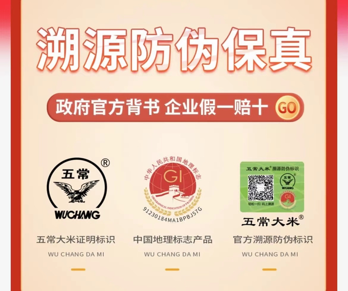 政府官方推荐购买五常大米到京东官方店铺,同时认准五常大米包装上的三个标志:五常大米官方溯源防伪标识、中国地理标志产品、五常大米证明商标(即产地的鹰标)。消费者通过微信“轻松一扫,码上溯源”。通过扫码,消费者能准确地得到该袋产品从产地、种植到加工、生产、销售的整个溯源信息。