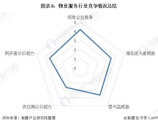 从五力竞争模型角度分析,目前,我国物业服务行业属于服务行业,替代品威胁较大;现有竞争者数量较多,但市场集中度处于持续提升阶段;上游供应商一般为房地产开发企业,议价能力适中,而下游消费市场主要是公共建筑、房地产、商业住宅等,议价能力较强;同时,因行业存在较为严格的准入资质以及资金门槛较高,潜在进入者威胁相对适中。