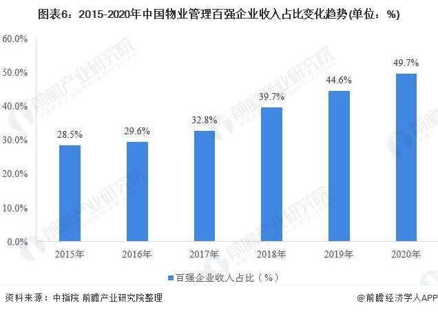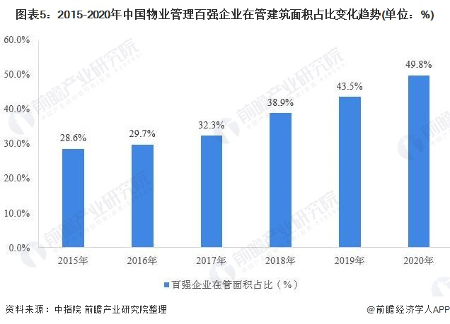 根据中指院发布的物业管理百强企业发展情况来看,2015年以来,我国物业管理百强企业在管建筑面积增长迅速,2020年,我国百强业务管理企业在管建筑面积已较2015年翻倍,增长至129亿平方米。与此同时,百强企业在管建筑占全国物业在管建筑面积的比重持续提升,由2015年的28.6%提升至2020年49.8%。
