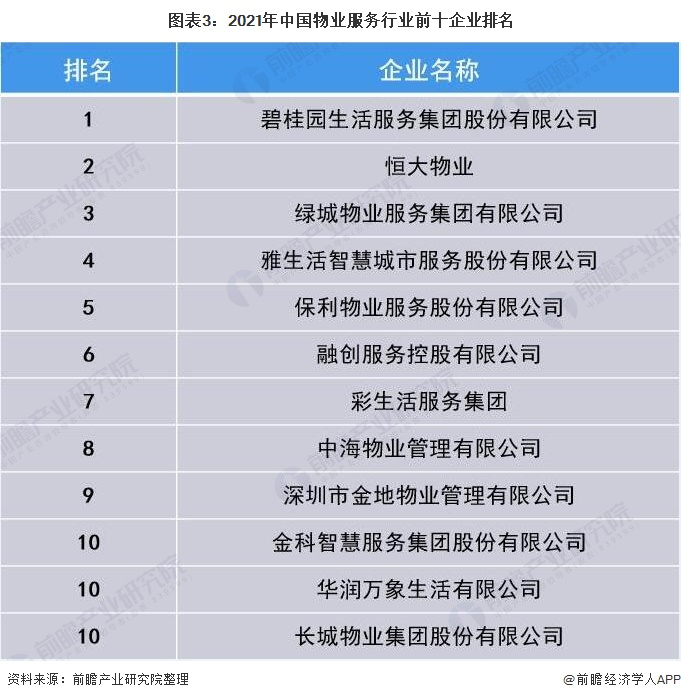 2021年4月,中指研究院、中国房地产TOP10研究组发布了“2021中国物业服务百强企业名单”,其中前十企业具体排名如下图所示: