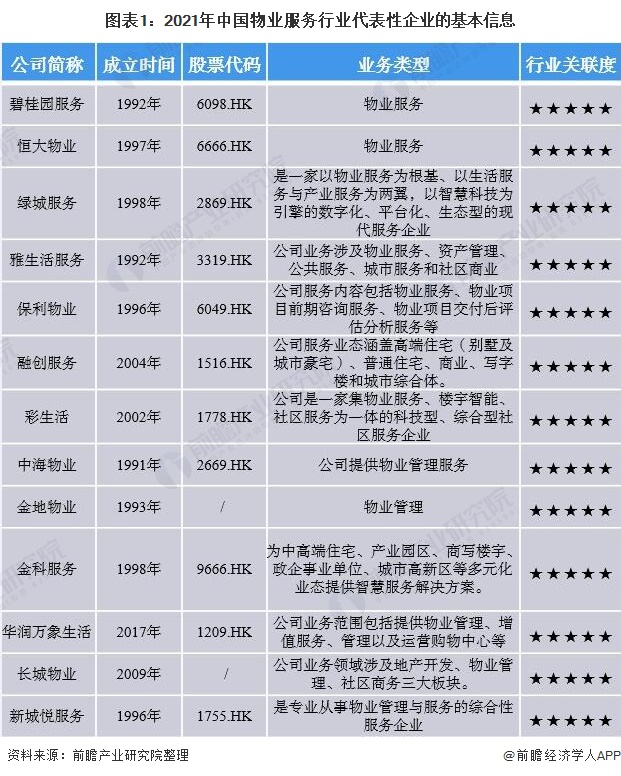 随着我国物业管理行业的发展,物业管理公司所提供的物业有关服务涉及领域越来越广,主要包括住宅物业、商业物业、办公大楼、公共物业、工业园以及医院等等。经过多年的持续快速发展,物业服务行业的参与者诸多。以下为我国物业服务行业代表性企业的基本信息: