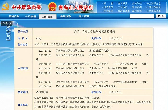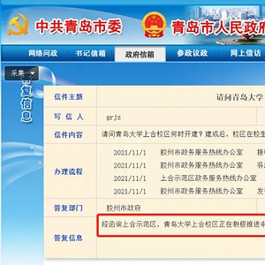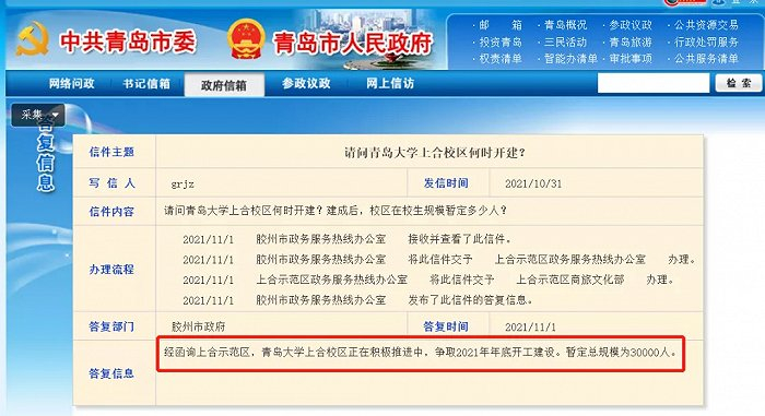 10月31日,有网友在青岛政务网市长信箱中咨询反映关于“青岛大学上合校区何时开建”的问题,并问询青岛大学上合校区何时开建?建成后,校区在校生规模暂定多少人?