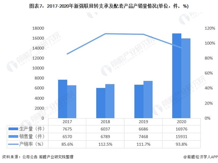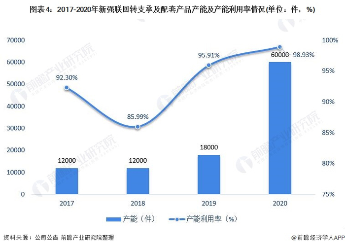 2017-2020年,新强联回转支承及配套产品的产能逐年提升,尤其是在2020年,产能增长至60000件,主要系由于下游风电行业看好,公司前期产能布局逐渐开始发力。