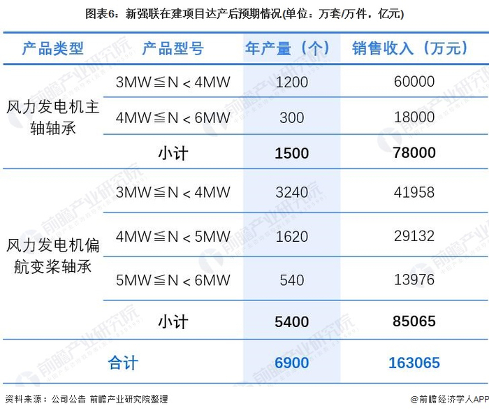 项目达产后年产风电轴承6900个,其中风电主轴轴承1500个,偏航变桨轴承5400个。参考现有产品的价格情况以及新产品预计的定价规划,不同型号产品的单价、数量和销售收入预测情况如下: