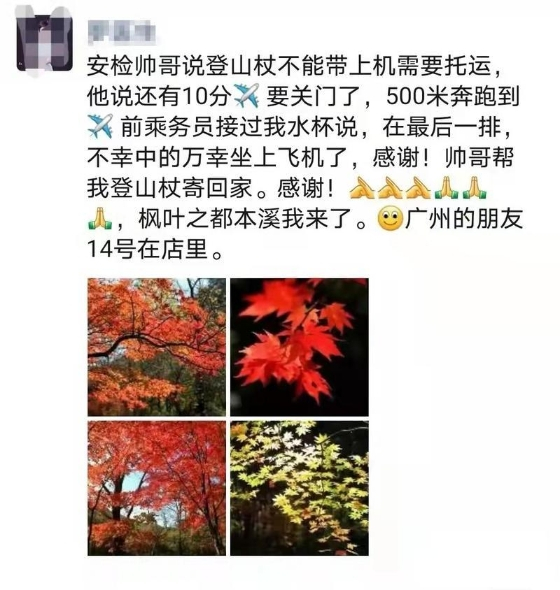 随后,他向罗小姐解释道:“根据民航局的相关规定,登山杖属于钝器,不能随身携带,只能办理托运手续。”罗小姐焦虑地说道:“这个登山杖我用了好久了,现在又马上要登机了,托运也来不及了,怎么办呀?”考虑到罗小姐的登机时间较为紧急,小许表示可以协助其将登山杖进行邮寄回家。最后罗小姐及时赶上了航班,并发朋友圈感谢这位乐于助人的安检小哥。
