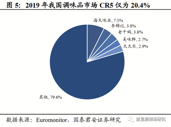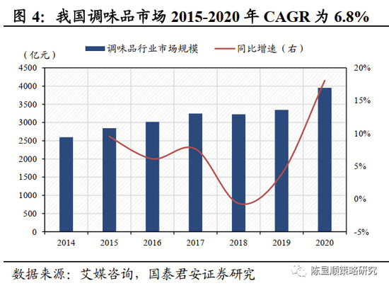 ▶ 调味品:市场规模温和增长,行业集中度有望提升。调味品是指能增加菜肴的色、香、味的辅助食品,主要包括酱油、食盐、醋等。近年来我国调味品市场规模增长稳健,据艾媒咨询统计,2020年我国调味品市场规模为3950亿,2015-2020年CAGR为6.8%。当前我国调味品市场集中度仍然较低,行业CR5仅20%左右,主因调味品与各地饮食特色高度相关,产品标准化难度大,且传统调味品资金、技术进入壁垒较低,当前仍然存在较多的中小企业。未来随着龙头企业的加速下沉,具备资本/产品/渠道/品牌优势的大厂商将逐渐蚕食家庭作坊及小企业的份额,行业集中度有较大的提升空间。