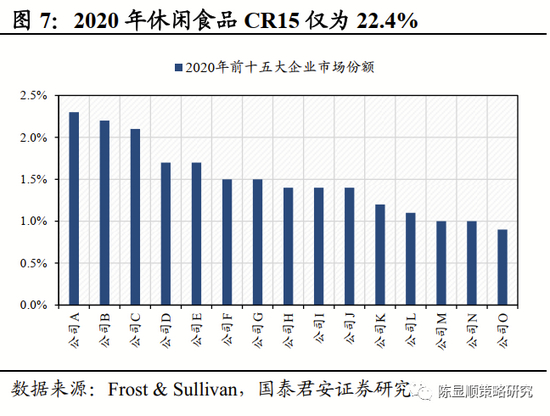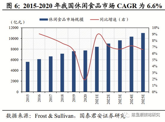 ▶ 休闲食品:市场规模持续增长,线上线下融合发展。休闲食品是在人们闲暇、休息时所吃的食品,主要包括坚果炒货、糖果、卤制品等。随着我国国民经济发展和居民消费水平的不断提高,休闲食品已成为日常食品消费的重要组成部分,据Frost & Sullivan测算,2020年我国休闲食品市场规模7749亿元,5年CAGR达6.6%,预计未来5年CAGR达7.3%。由于休闲食品品类众多,因此行业集中度相对较低,2020年CR15仅为22.4%。随着我国电商发展的逐渐成熟,部分休闲食品企业受益于流量红利而高速发展,但随着互联网渗透率逐步见顶,行业发展红利边际递减,部分线上销售遭遇瓶颈正在倒逼企业加速线下销售渠道发展,未来线上线下融合的新零售模式或将是行业的发展方向。