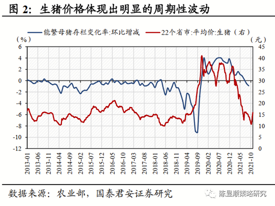 ▶ 生猪养殖:周期性特征明显,能繁母猪存栏变化是最为重要的观测指标。生猪作为大宗商品,价格波动具有周期性,通常遵循着“生猪价格上涨-能繁母猪补栏-生猪供大于求-猪价下跌-能繁母猪产能去化-生猪供不应求-猪价上涨”的过程。其中能繁母猪作为行业的基础产能,其变化率是最为重要的观测指标,依据历史经验来看,能繁母猪存栏变化通常领先生猪价格9个月时间。近年来,我国生猪规模化养殖比例逐步扩大,根据中国畜牧业协会统计,我国生猪年出栏1000头以上养殖场占比由2010年的34%提升至2019年的41%,规模效应致使养殖成本不断降低,部分大型猪企在行业普遍亏损下依旧能够依靠成本优势保持盈利,持续进行产能扩张,能繁母猪去化速度放缓拉长了行业下行周期。