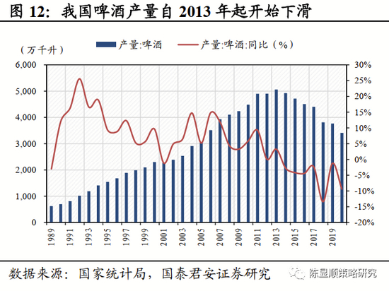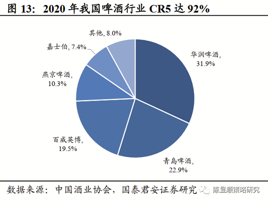 ▶ 啤酒:行业由成长期逐步向成熟期过渡,效率提升与高端化是发展趋势。啤酒传统上是重资产、高周转、薄利多销的行业,且工业啤酒受产品新鲜度以及运输成本的制约,运输半径受到较大程度的限制,经营的区域性特征明显。为实现全国扩张,抢占优势市场,1997-2013年行业兼并整合浪潮开启,龙头凭借资本优势跑马圈地,行业集中度快速提升,销量口径CR5从2005年的47%增长到2013年的70%,华润、青啤、百威、燕京、嘉士伯的五霸格局确立,这一阶段中国啤酒产量维持较快增长,复合增速达到6.4%。2014年以后,受人口老龄化及居民健康意识提升的影响,啤酒产量见顶回落,前期无序扩张导致的产能过剩、利润率下滑问题逐步显现,倒逼企业进行“去产能”转型。2016年起,企业重心逐步从“市场份额导向”向“经营效率导向”转型,啤酒行业新增产能、固定资产投资完成额均大幅下降,龙头企业开始关停小规模、低效率、高成本的工厂,行业利润率回升显著。2020年全国啤酒行业CR5提升至92%,各大市场基本已被瓜分完毕,行业从成长期逐步向成熟期过渡。当前行业产能去化、降本增效仍在继续,产品结构升级亦稳步推进,预计效率提升与高端化将是下一阶段企业的核心竞争要素。
