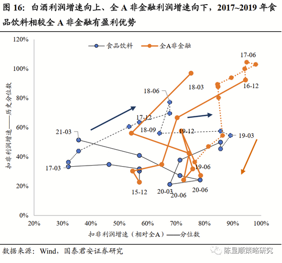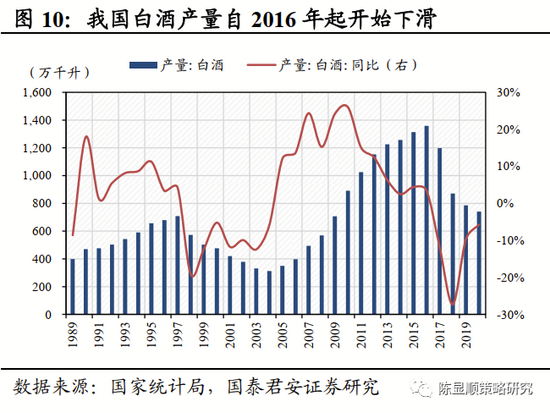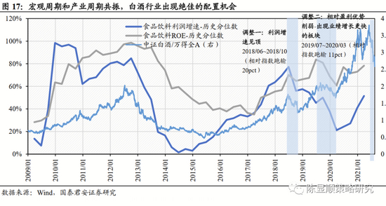 宏观周期和产业周期共振,必选消费酝酿出绝佳的配置机会。白酒景气周期向上、经济周期向下,2017~2019年食品饮料相较全A非金融具有盈利相对优势。由于内外需双疲软,宏观经济于2017年周期性见顶。清理PPP、问责违规举债、资管新规等系列去杠杆行动使得基建投资悬崖式下滑,基建投资增速从2016~2017年的15.7%、14.3%骤降至2018年的1.8%。棚改货币化退坡、因城施政限购、地产境外融资收紧,资金链紧张使得房企放缓施工节奏,地产建安投资从2016~2017年的9.3%、7.7%跌至2018年的3.6%。GDP当季同比在2017年初~2019年末趋势性下滑。此时白酒行业从底部开启复苏,2015~2016年大部分上市酒企取得了显著的恢复性增长。商务和大众宴请成为高端白酒的消费主力,行业发展动能从过去的总量扩容转变为集中度提升,泸五茅行业产量占比从2013年的3%增至2018年的4.8%。同时,由于成功转型大众和商务消费,白酒与宏观经济的相关性减弱。宏观周期和产业周期共振,白酒酝酿出绝佳的配置机会,自2016年起食品饮料年收益率连续五年排在行业涨幅前五。
