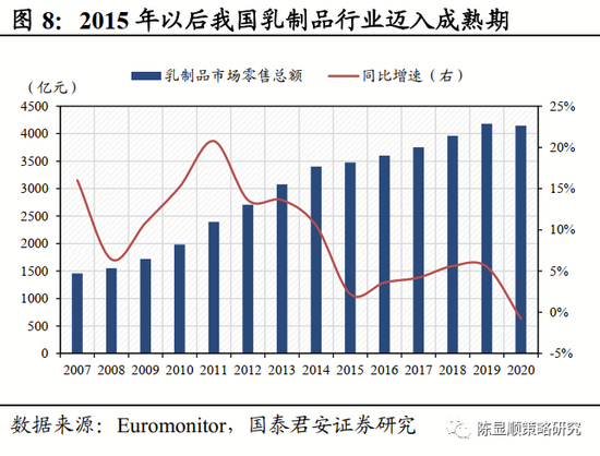 ▶ 乳制品:双寡头格局稳健,区域及地方乳企差异化竞争。上世纪90年代,我国液态奶以保质期较短的低温巴氏奶为主,由于我国牧场主要分布于内蒙、新疆等北方地区,奶源分布不均衡以及冷链运输技术不成熟制约了早期我国奶业的发展。1997年,国内乳企开始大规模引入海外的利乐包及UHT灭菌技术,用该技术生产的常温奶保质期可达6-9个月,有效的克服了奶源运输问题。彼时伊利、蒙牛最早布局常温奶,并在全国范围内迅速扩张,双寡头格局初现。此后行业价格战频发,中小企业被迫退出市场或放弃常温,专注于发展低温产品。以蒙牛、伊利双寡头垄断,区域及地方乳企低温奶差异化竞争的格局逐步稳定。近年来,随着居民健康意识兴起,传统常温奶需求增速疲软,已步入成熟期,更为健康和营养为特征的巴氏奶需求增长迅速,据欧睿统计,2020年我国乳制品市场零售总额4146.2亿元,同比下滑0.8%,其中UHT奶同比下滑3.5%,巴氏奶逆势增长5.2%。