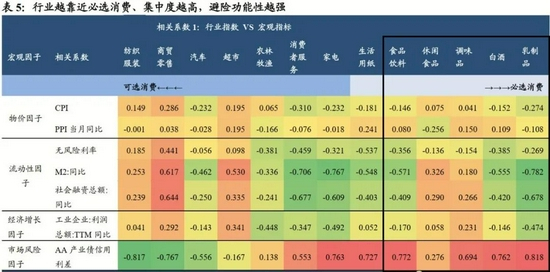 行业越靠近必选消费、集中度越高,避险功能性越强。从消费板块的不同行业看,越是靠近必选消费、行业集中度越高,逆经济周期和避险的功能性就越强。在必选消费链中,农林牧渔、乳制品、白酒、生活用纸基本面与宏观经济周期相关性低,行业指数在经济下行、市场风险放大环境下通常有较好表现。可选消费中纺服、汽车、商贸零售,和必选消费中的休闲食品、调味品基本面与宏观经济周期相关性更强,抗风险能力相对更弱。我们认为行业是归属可选消费还是必选消费,并不是判定行业避险能力强弱的绝对标准,行业集中度同样起到了重要影响。比如同样归属于可选消费,集中度更高的家电行业避险能力就高于汽车行业。