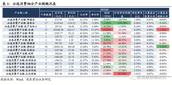 从必选消费产业链财务指标与公募基金配置比例来看,盈利能力最优的行业集中于白酒、乳制品、肉制品以及休闲食品行业,白酒依旧是公募基金最为青睐的细分产业。必选消费产业链细分行业众多,其中白酒、调味品行业市值较大,均超过了万亿规模。从2021年三报数据来看,盈利能力ROE水平较高的行业集中在白酒(25.07%)、乳制品(20.83%)、肉制品(20.04%)以及休闲食品(17.70%)行业。相较而言,上述盈利能力较强的行业也更受公募基金青睐,其中竞争格局清晰,业绩表现稳定的白酒行业超配比例最高(1.27%)。