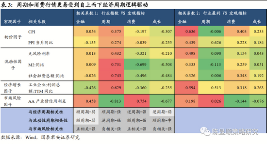 消费板块更易受自上而下逻辑驱动,配置机会通常出现在经济下行、市场不确定风险提高的时期。宏观环境如何影响不同行业的盈利?宏观预期又如何影响行业指数走势?我们将中信风格指数超额收益(风格指数收盘价/wind全A收盘价)、归母净利增速分别与代表物价(CPI、PPI)、流动性(M2、社融、无风险利率)、经济增长(工业企业利润增速)、市场风险(信用利差)的因子计算相关系数,可以发现:▶ 从基本面看,所有板块盈利都是顺经济周期的。金融、周期、消费、成长板块归母净利增速与工业企业利润增速正相关,从盈利和经济周期关联度强弱看,金融>周期>消费>成长。▶ 从股市行情看,周期和消费行情更易受到自上而下经济周期逻辑驱动,成长行情易受产业逻辑驱动,金融行情易受避险逻辑驱动。对比四类风格指数与宏观因子的相关性,可看出周期指数与经济增长因子强正相关,消费指数与流动性因子强负相关,而金融和成长指数与宏观因子相关度相对低,但两者原因存在差别:成长板块基本面与经济周期相关度低,行情多由产业逻辑驱动;金融板块基本面与经济周期相关度高,但在经济复苏期盈利弹性不足,不被作为进攻的首选,金融指数和债券信用利差呈正相关关系,表明市场多基于避险逻辑配置该板块。▶ 消费板块配置机会通常出现在经济下行、市场不确定风险提高时期。总结宏观环境和风格配置之间的关系:1)消费:有抗经济周期和避险双重属性。在经济有下行压力、无风险利率下行、市场不确定风险提升的环境中,消费板块跑赢市场的概率越高;2)周期:顺周期、对市场风险敏感。板块基本面与经济增长周期相关度高,行情拐点靠自上而下逻辑驱动。在经济处于复苏、无风险利率上行、社融回升、市场不确定性风险下降环境中,周期表现更佳;3)成长:产业逻辑驱动、对市场风险敏感。板块基本面与经济增长周期相关度低,景气拐点靠产业逻辑驱动,流动性宽松对板块上涨有促进作用,但不是主导因素。板块对风险评价高度敏感,当市场潜在风险放大时,通常板块表现较差;4)金融:避险属性占主导。基本面与经济周期强相关,但行情与基本面周期相关度低,更多由避险逻辑驱动。