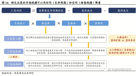▶ 市场规模:特定品类的市场规模可以用时间(生命周期)和空间(销售规模)衡量。不同消费品差异化程度高,产品生命周期延续性强,例如百威啤酒、可口可乐从推出到销量见顶,历时均超过100年,全球市场销售规模超过2000亿元。水大鱼大,在时间和空间两个尺度上都足够大的市场,更容易形成品牌力并培育出寡头型企业。产品销售规模与目标客群、销售半径(全国性、区域性)、产品属性和品牌溢价能力(大众快消、奢侈品)。单从规模而言,休闲食品(7700亿)>白酒(5800亿)>调味品(4000亿)。▶ 所处阶段:所处生命周期阶段不同,研究侧重点不一。品类导入期关注产品渗透率,成长期关注渠道效率、品牌力建设,两者最终结果表现为市占率的提升。投资维度重点三类机会:1)大容量+高成长(市场规模在1000亿以上,增速超过10%),如高端白酒、速冻食品;2)大容量+低成长+集中度提升(市场规模在500亿以上,增速低于10%),如乳制品、酱油;3)小容量+爆发期+新品类,如复合调味料、预调鸡尾酒,此类产品缺点是市场规模小(不超过500亿)、生命周期持续相对短(rio成长期仅有2年,营养快线为10年)。