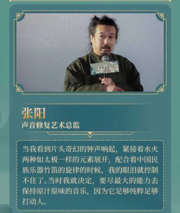 这样的风格也成了张阳在修复声音时面临的挑战。因为在声音剥离的技术上还有一部分的音轨无法彻底分离干净,需要重新编配,加之影片中其实有许多“大场面”需要声音辅助来创造更大的空间感,因此,这一版的声音也有许多需要再创作的部分。今天电影的音效大多是力求真实地还原场景,而在制作《天书奇谭》的声音时,张阳首先考虑的是“加什么声音才能够体现在原来的那种思路”。