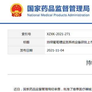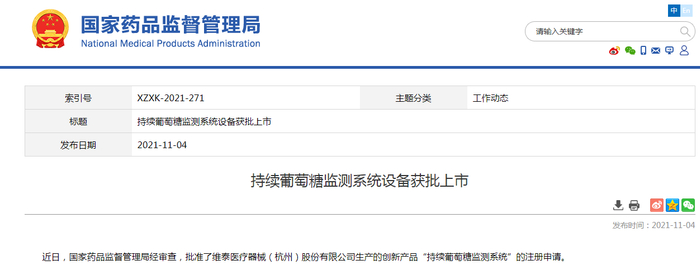 原标题:维泰医疗器械(杭州)股份有限公司生产的持续葡萄糖监测系统设备获批上市 来源:国家药监局网站